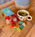 Склад: цукор, патока крохмальна кукурудзяна (сироп глюкозний), драглеутворювач пектин, вода питна, регулятор кислотності лимонна кислота, ароматизатори («Вишня», «Персик», "Груша", "Яблуко", "Малина", "Полуниця", "Кокос", "Грейпфрут", "Лимон", "Чорниця", "Чорна смородина", "Кола", "Ананас", "Диня", "Банан", "Барбарис", "Гранат" ), екстракт імбиру барвники натуральні («Чорна морква», «Бета-каротин Е160 а», "Хлорофіл").